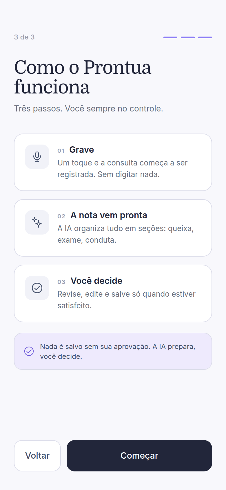 Prontua captura a consulta automaticamente e gera notas SOAP com IA. Sem mudar sua rotina. R$3,90 por nota.